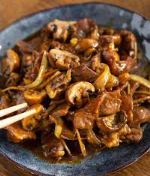 Boneless sliced beef, mushroom, onion & capsicum cooked with flavored zesty ginger