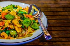 Pad Thai noodles cooked with mixed vegetable, ground nut, sliced chick...